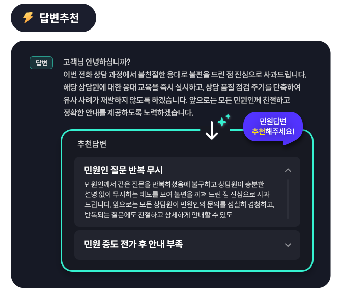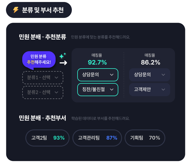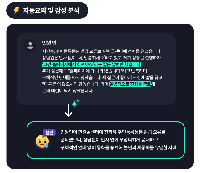 - 감정 분석 : 고객의 감정 상태를 정확히 파악하여 민원의 우선순위를 지능적으로 조정합니다.