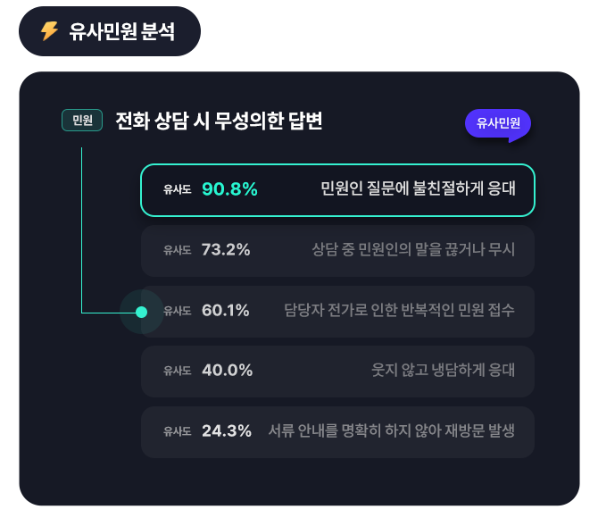 - 반복 민원 식별 : 내용이나 형식을 약간씩 변경하여 수십, 수백 건 제시되는 반복적인 민원까지 자동으로 식별해냅니다.